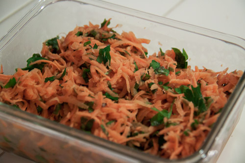 This carrot salad is a nice change from the traditional carrot raison salad most North Americans are probably familiar with. Take it to a potluck and watch people delight in the flavor surprise brought about from the coriander and mint. It’s also pretty quick to make, especially if you have a Cuisinart that will do the shredding for you.
